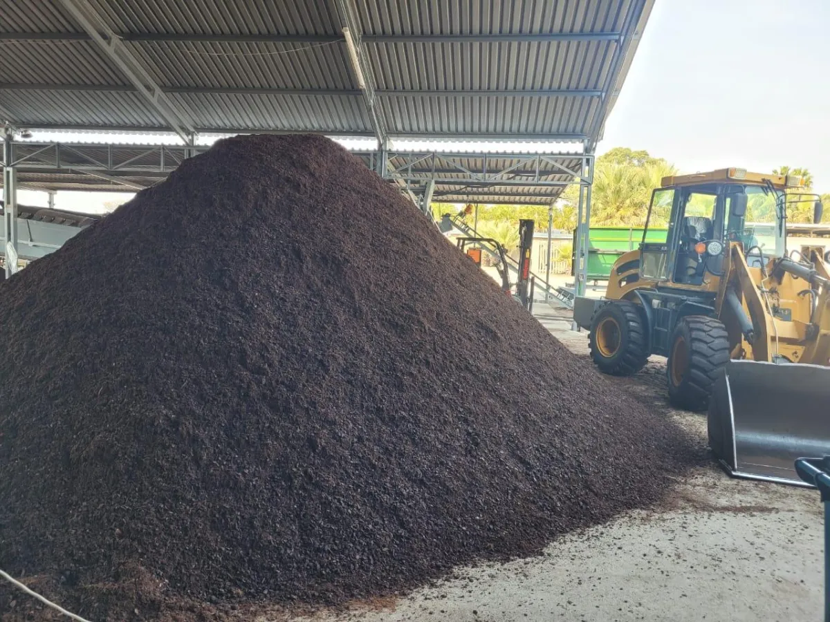 The production takes place through thermophylic composting. Fresh bark is milled into a specific size, urea and water is added, and then this mixture is placed in long windrows. Temperatures are regularly monitored, and when the heap reaches 70 deg C, it is turned and aerated for the heat build-up to start again. This process repeats itself three times during a four month period.